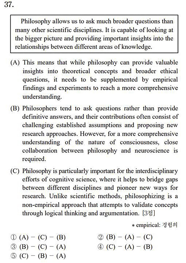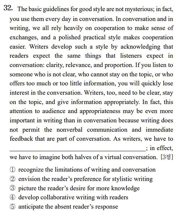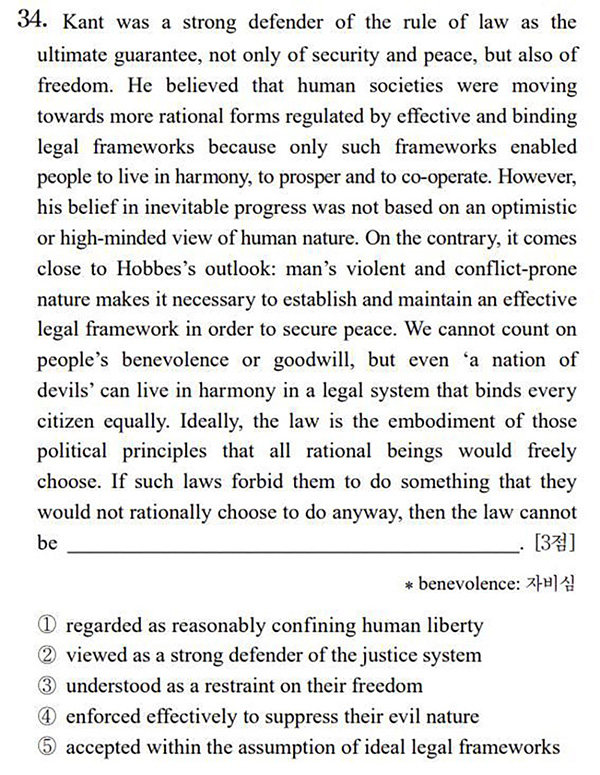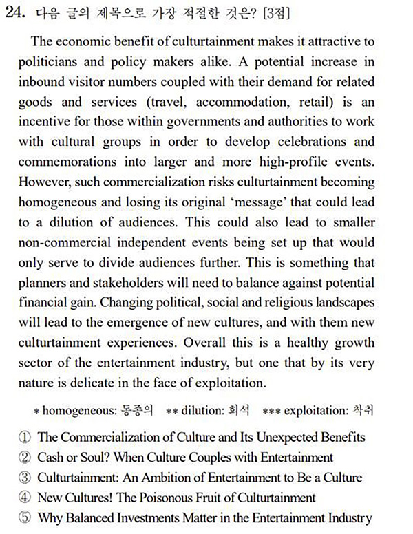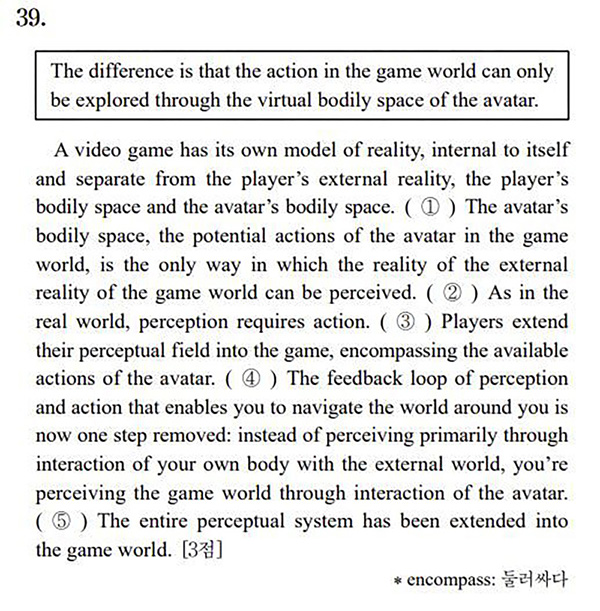 The CSAT has several sections including a Korean language and literature, mathematics, and social and natural sciences, but there is also an English section. And the English section is notorious for being difficult even for native English speakers. Here are some questions from the English section from this year’s exam. Can you solve these?