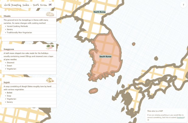 I had fun clicking around the various countries to see what types of dumplings exist in different parts of the world. Take a look and see if the dumpling(s) you know is accurately presented. If not, you can always provide feedback on the bottom right side of the screen!